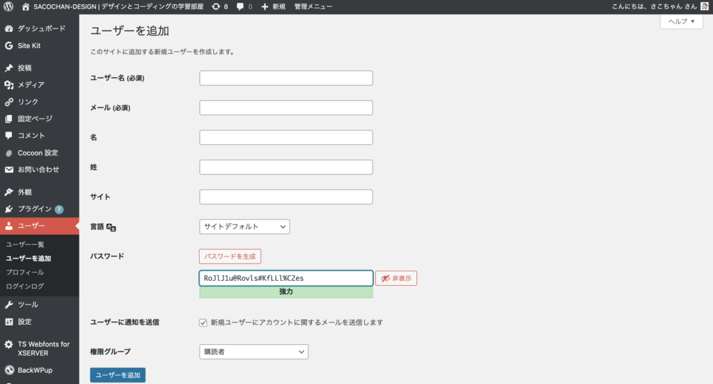 管理画面のユーザー > ユーザーを追加 をクリックすると、以下の画面に移動します。