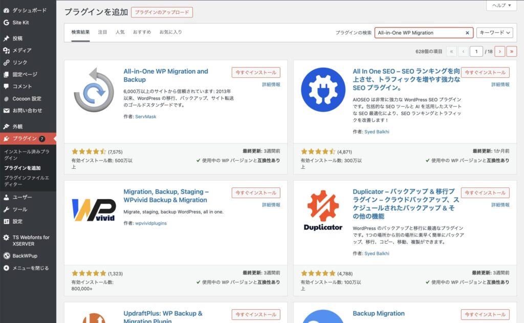 管理画面の左メニューの「プラグイン」→「新規追加」をクリックし、「All in One WP Migration」を検索します。