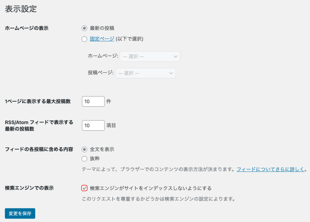 「検索エンジンでの表示」の「検索エンジンがサイトをインデックスしないようにする」にチェックを入れます。